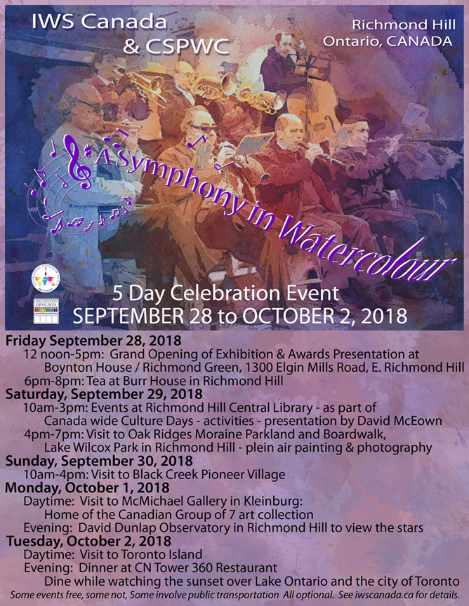 The ribbon cutting occurs at noon at Boynton House and Richmond Green on September 28. We will have some music at 2:30, then awards and speeches at 3:00 pm. The exhibition paintings at Boynton House will of course be available all afternoon until 5:00 pm, and many of the master painters will be attending. Throughout the afternoon there will be opportunities for plein air painting. Also, there will be representatives from Winsor & Newton, QoR Watercolours, Daniel Smith, DeSerres Art Store, Da Vinci paints and RockWell Art Supplies demonstrating products.