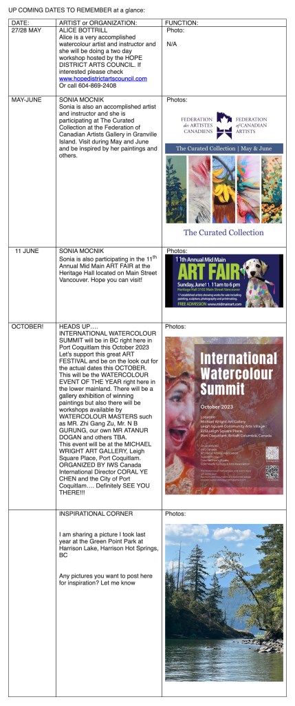 Hello everybody and so happy to feel the sun warming up in all areas of British Columbia… some of you may also be getting ready for some Plein Air painting and I hope all your new adventures are successful.