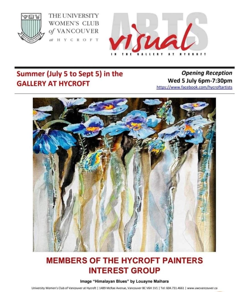 | 05 JULY – 05 SEPTEMBER | ARTS VISUAL in the Gallery at Hycroft Presented by the University Woman’s Club of Vancouver at Hycroft Two of our IWS CANADA/BC Members are presenting in this exhibition: SONIA MOCNIK & LOUAYNE MAIHARA which takes place at the Hycroft Mansion, Opening Reception is coming soon but if you miss the Reception, this exhibition will be available until September 5, I am sure you will not be disappointed! Opening Reception Wed. 05 July 6pm-7:30pm | ![]() |
