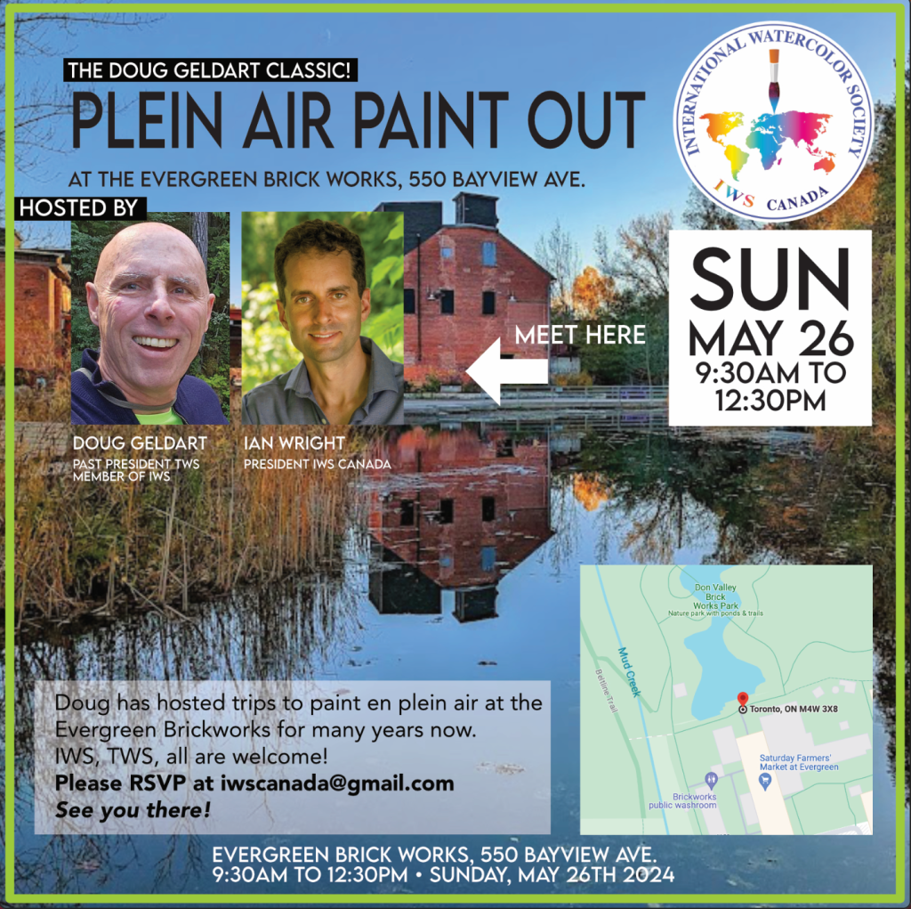 Our next Plein Air Paint out, at the Evergreen Brickworks, 550 Bayview Avenue, Toronto. (by the pond) From 9:30am to 12:30pm on Sunday May 26th, featuring past TWS president Doug Geldart, and IWS Canada President Ian Wright.